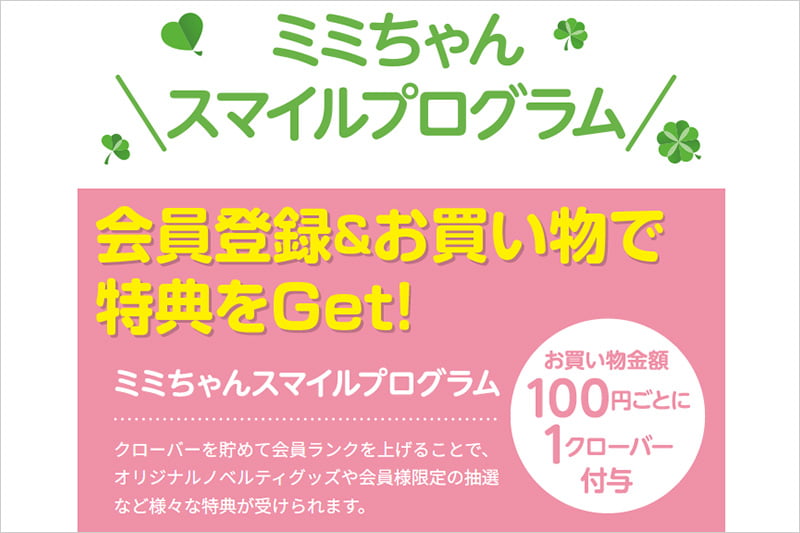 ミミちゃんスマイルプログラムでは、お買い物金額100円ごとに、1クローバーが付与されます。