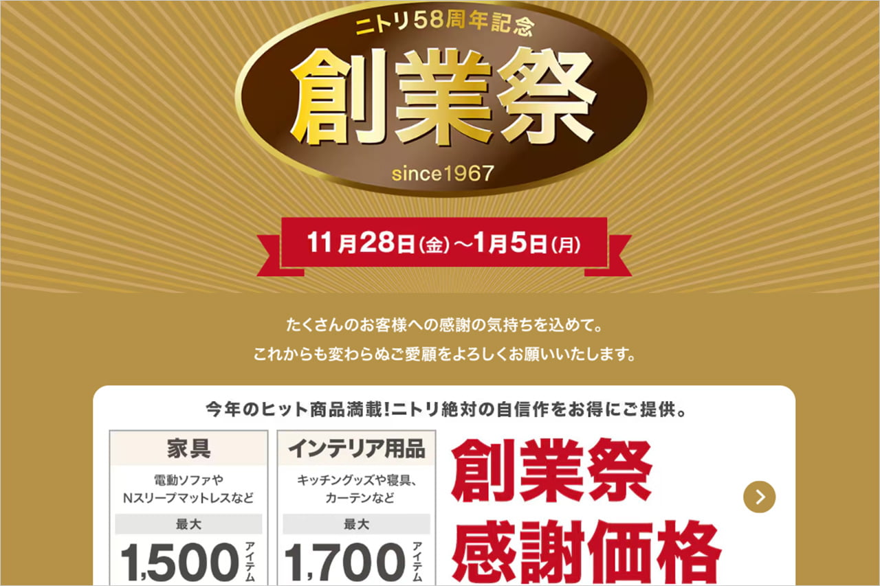 ニトリ58周年記念 創業祭以外のセールは、以下ページもご覧ください。